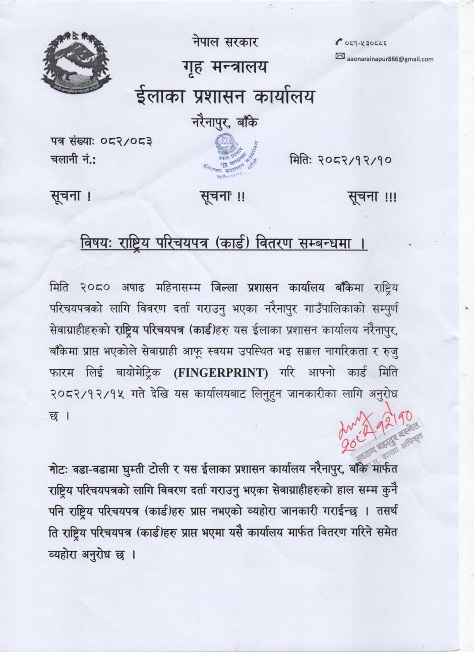 राष्ट्रिय परिचयपत्र (कार्ड) वितरण सम्बन्धमा।